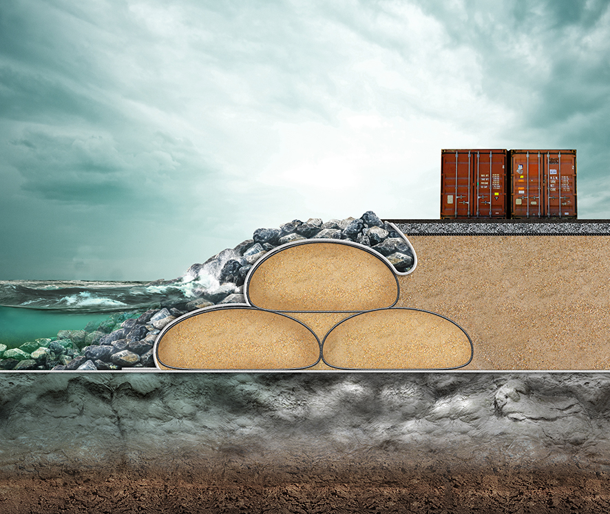 Además, se suelen utilizar geotubos para esta aplicación, como sustituto a las ataguías temporales tradicionales y también para reforzar y mejorar las estructuras artificiales de protección contra inundaciones, como los diques y también dunas naturales. Los tubos y sacos pueden instalarse como núcleo de una nueva construcción o con posterioridad, por ejemplo, cuando se trata de ampliaciones los diques o de construir rellenos filtrantes.