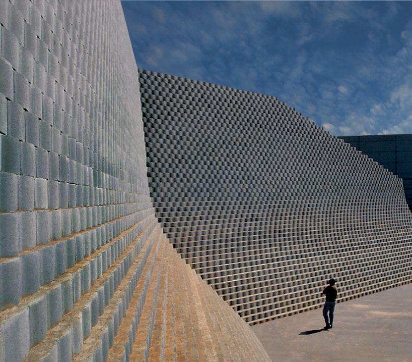 Bloques modulares (Sistema Terrae), encofrado de piedra con mallas metálicas galvanizada (Sistema Quadratum) y paneles prefabricados de hormigón vinculados pasivamente.