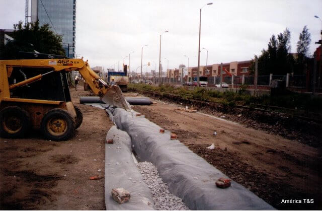 En el caso de drenes longitudinales se utiliza el geotextil en zanjas de intercepción y captación de aguas, basado en la construcción del clásico dren francés (de piedra partida con o sin caño). Mediante el revestido de la zanja con una manta de geotextil se evita el acarreo de los finos del suelo hacia el interior del dren, impidiendo su colmatación y consecuente pérdida de efectividad.